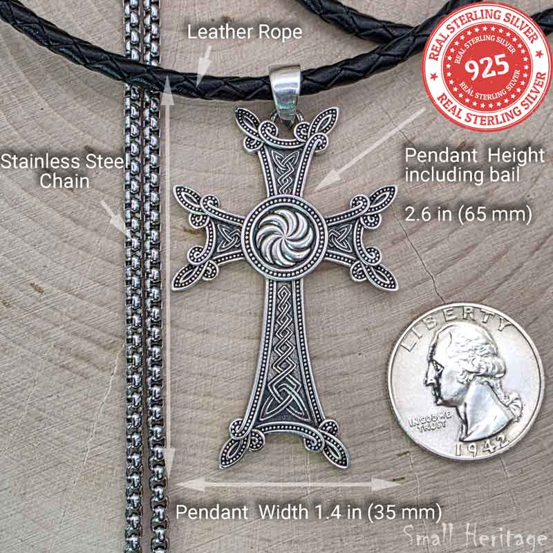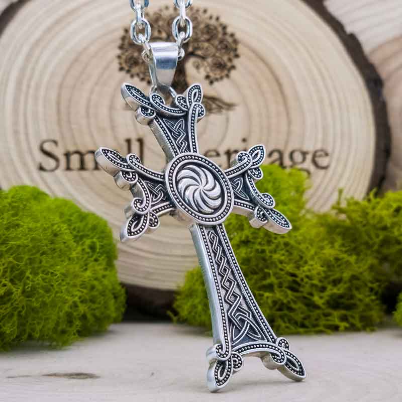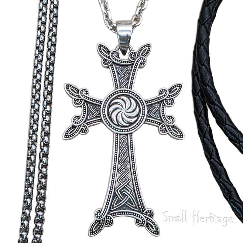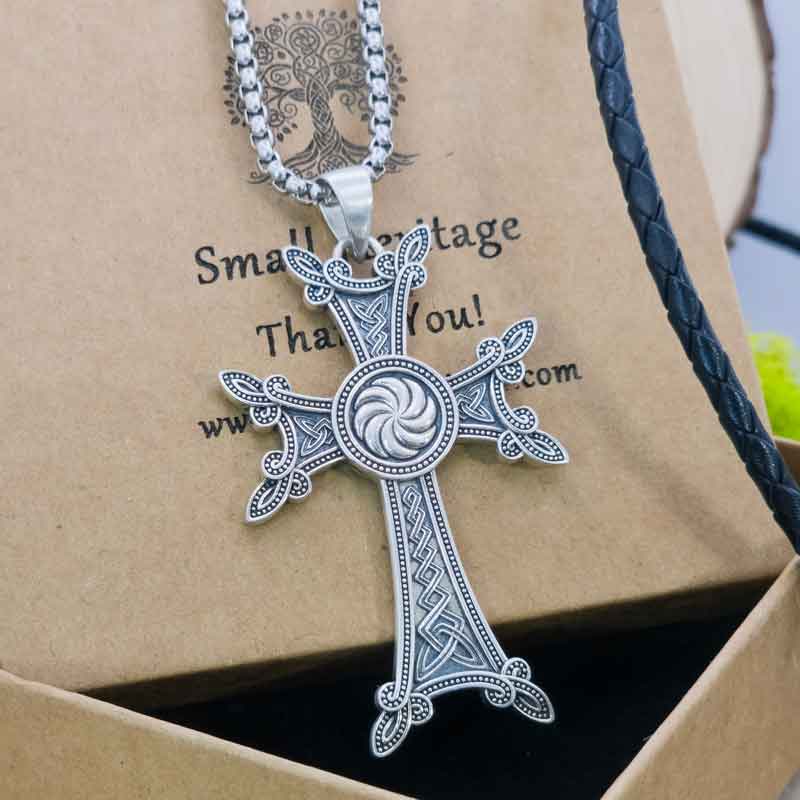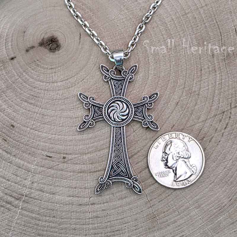 Discover the elegance and profound cultural significance of our Large Armenian Cross Necklace, meticulously handcrafted by the Small Heritage team. Designed by S.M.(a key designer and esteemed member of our team) and produced by Small Heritage LLC, this exquisite piece embodies the rich heritage and enduring spirit of Armenian culture, drawing inspiration from medieval Armenian art, churches, and khachkars.