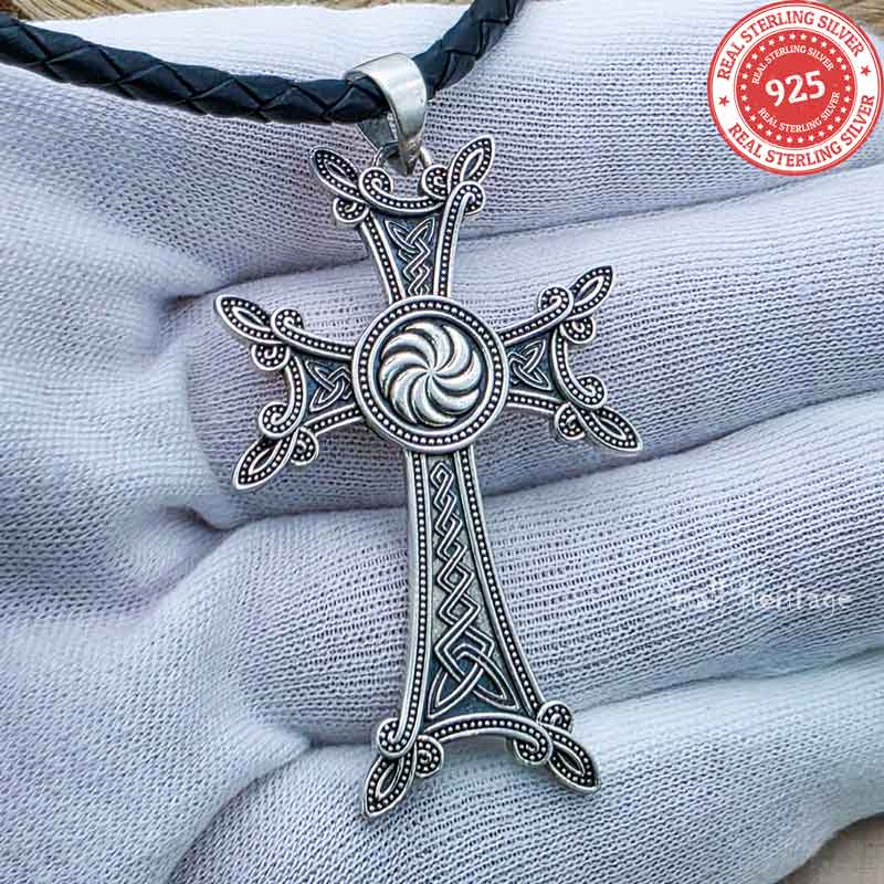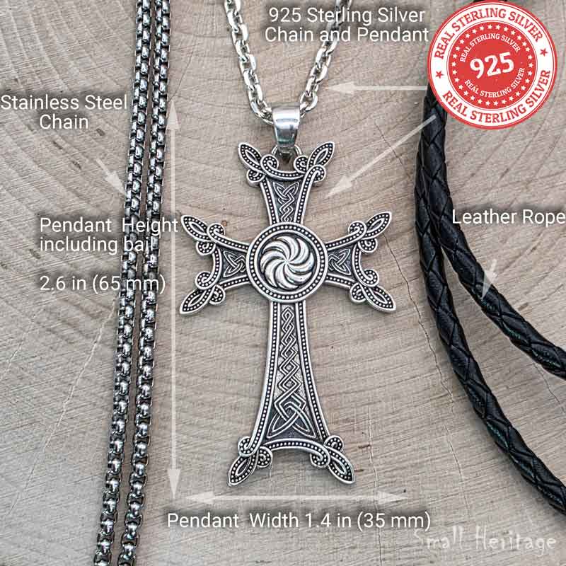 925 Sterling Silver Large Armenian Apostolic Cross Necklace Medieval Style Eternity Pendant Men
