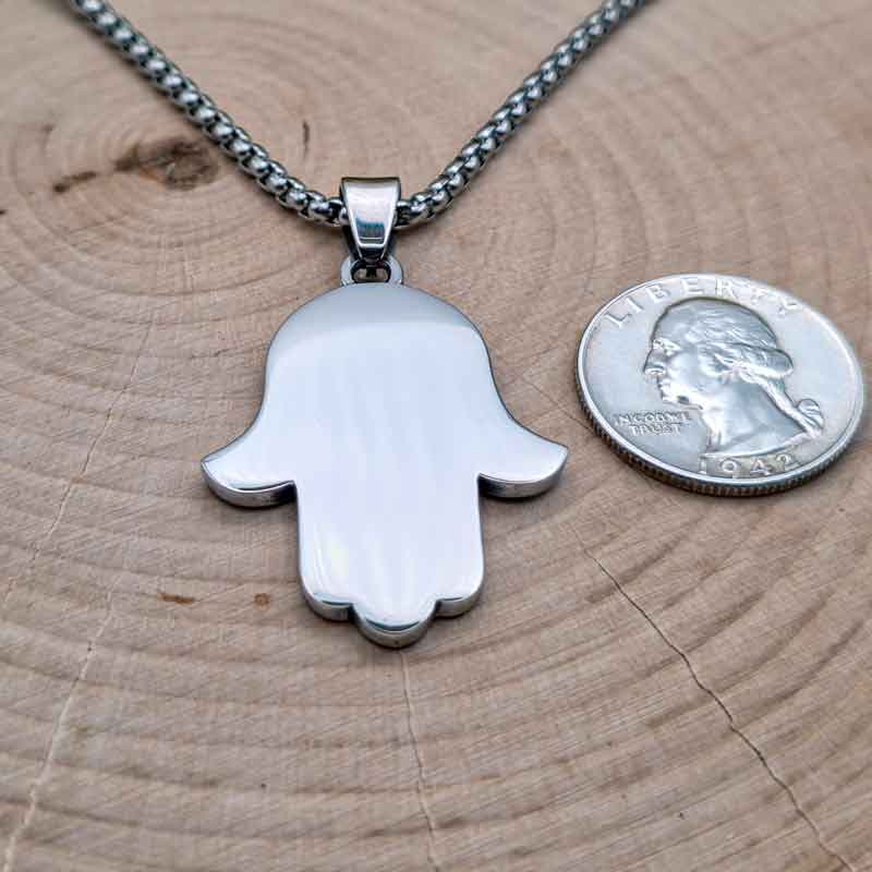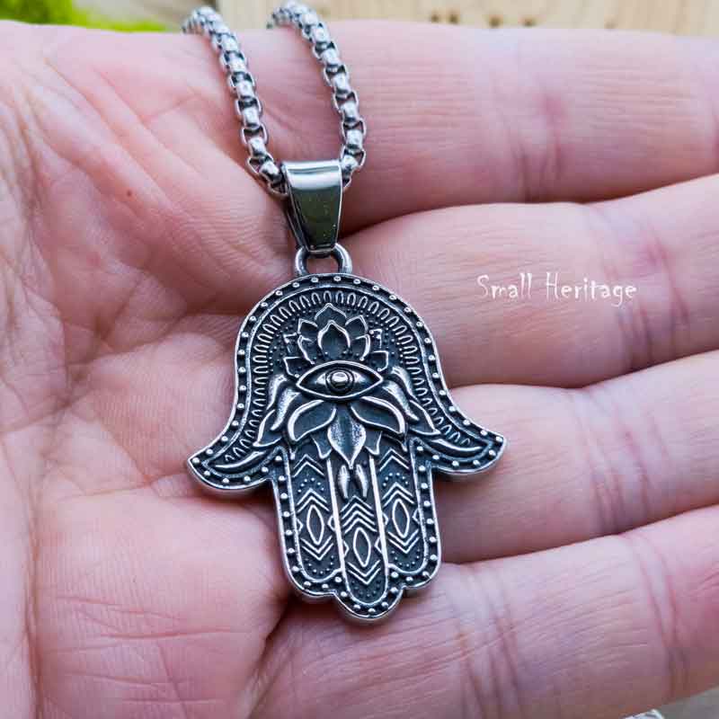 Add a touch of Middle Eastern–inspired artistry to your look with this Evil Eye Hand of Fatima Necklace. Crafted from high-quality stainless steel, this decorative pendant combines the well-known Hand of Fatima (Hamsa) shape with an Evil Eye design, creating a modern piece inspired by traditional cultural motifs.